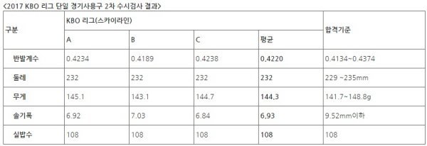 KBO(총재 구본능)가 12일 2017 타이어뱅크 KBO 리그 경기사용구 2차 수시검사 결과를 발표했다.
