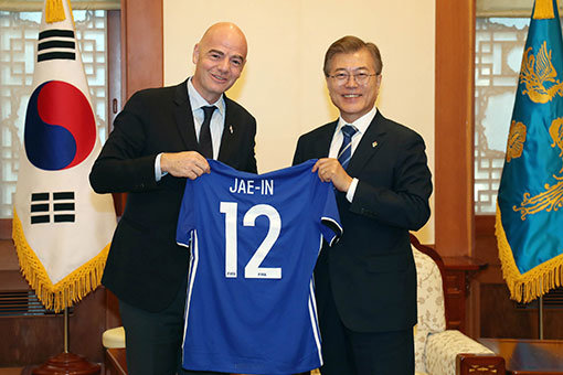 청와대 관계자에 따르면 문 대통령은 12일 청와대에서 인판티노 회장을 만나 “남북한을 포함한 동북아 주변국과 월드컵을 공동개최하면 평화 조성에 도움이 되지 않을까 생각한다”고 말했다. 이에 인판티노 회장은 “조만간 시진핑 국가주석을 만나러 중국에 가니 물어보겠다”고 화답했다. 접견에는 김수현 청와대 사회수석, 노태강 문화체육관광부 제2차관, 정몽규 대한축구협회장 등이 동석했다.