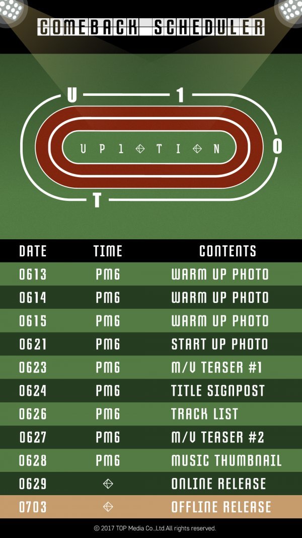 사진에는 초록색 바탕의 스포츠 스타디움 콘셉트의 전광판 조명이 육상 트랙을 생동감 넘치게 형상화한 업텐션의 새로운 엠블럼에 빛을 비추고 있다. 하단에는 오늘 13일부터 오프라인 앨범 발매일인 7월 3일까지 진행될 컴백 프로모션 일정이 안내 되어 있으며 \'웜 업\' 포토, \'스타트 업’ 포토 등 스포츠 용어를 활용한 콘텐츠 공개들이 예정되어 있다.