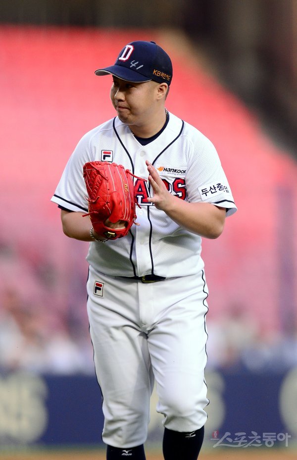 13일 잠실야구장에서 ‘2017 타이어뱅크 KBO 리그’ LG트윈스와 두산베어스의 경기가 열렸다. 선발 투수로 등판한 두산 유희관이 2회초 1사 1루 상황에서 LG 정상호를 병살타로 처리한 후 박수를 치고 있다.
