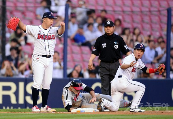 13일 잠실야구장에서 ‘2017 타이어뱅크 KBO 리그’ LG트윈스와 두산베어스의 경기가 열렸다. 3회초 1사 1루 LG 이천웅 중전 안타 때 1루주자 이형종이 3루까지 달려 세이프 판정되자 두산 유희관이 비디오판독을 요청하고 있다. 비디오판독 결과 세이프.