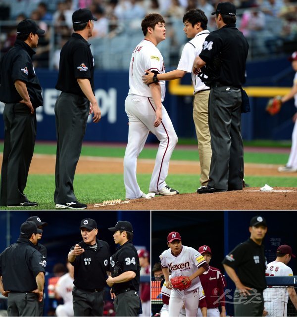 13일 서울 고척 스카이돔에서 ‘2017 타이어뱅크 KBO리그’ 넥센 히어로즈와 NC 다이노스의 경기가 열렸다. 3회초 넥센 선발 한현희가 첫 타자를 앞두고 부상으로 금민철로 교체되자 4심이 모여 회의끝에 같은 유형(오른손)의 투수 교체를 지시했다. 이에 넥센은 금민철 대신 오윤성을 등판시켰다.