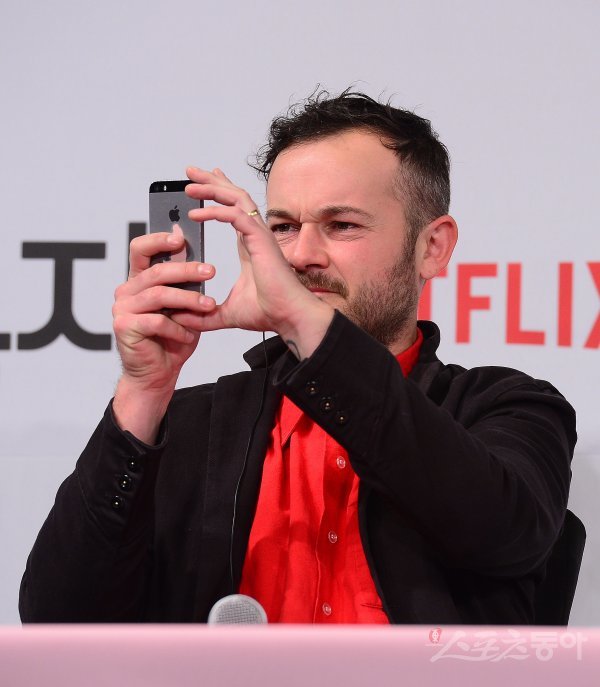 14일 서울 광화문 포시즌스 호텔에서 영화 ‘옥자’ 기자회견이 열렸다. 다니엘 헨셜이 기자회견 중 스마트폰으로 기자회견장을 찍고 있다.
