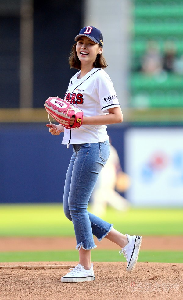 14일 잠실야구장에서 ‘2017 타이어뱅크 KBO 리그’ LG트윈스와 두산베어스의 경기가 열렸다. 경기 전 탤런트 구재이가 시구를 하고 있다.