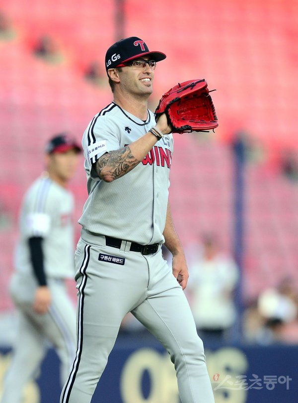 14일 잠실야구장에서 ‘2017 타이어뱅크 KBO 리그’ LG트윈스와 두산베어스의 경기가 열렸다. 선발 투수로 등판한 LG 니퍼트가 2회말 두산 에반스의 타구를 처리해 아웃시킨 후 웃고 있다.
