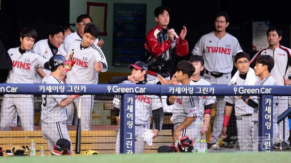 14일 잠실야구장에서 ‘2017 타이어뱅크 KBO 리그’ LG트윈스와 두산베어스의 경기가 열렸다. 4회초 1사 1,3루 LG 오지환이 선제 1타점 적시타 때 득점한 양석환이 더그아웃에서 하이파이브 하고 있다.