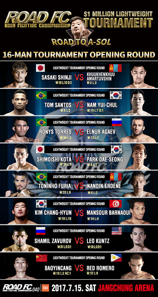 7월15일 장충체육관에서 벌어지는 ‘ROAD TO A-SOL’16강 토너먼트 매치업. 100만 달러의 상금을 놓고 전세계 MMA 파이터들이 겨루는‘꿈의 대결’본선무대다. 사진제공 ㅣ ROAD FC