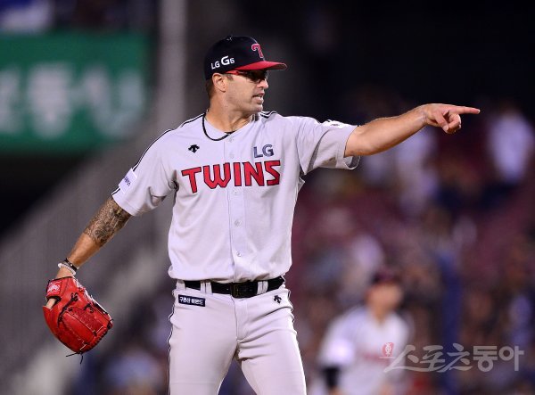 14일 잠실야구장에서 ‘2017 타이어뱅크 KBO 리그’ LG트윈스와 두산베어스의 경기가 열렸다. 선발 투수로 등판한 LG 허프가 7회말 두산 최주환의 타격이 헛스윙이라며 어필하고 있다.