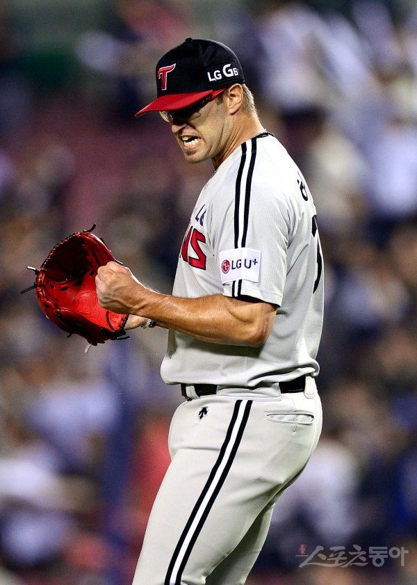 14일 잠실야구장에서 ‘2017 타이어뱅크 KBO 리그’ LG트윈스와 두산베어스의 경기가 열렸다. 선발 투수로 등판한 LG 허프가 8회말 2사 두산 박건우을 외야플라이로 아웃시킨 후 포효하고 있다. 잠실 | 김종원 기자 won@donga.com