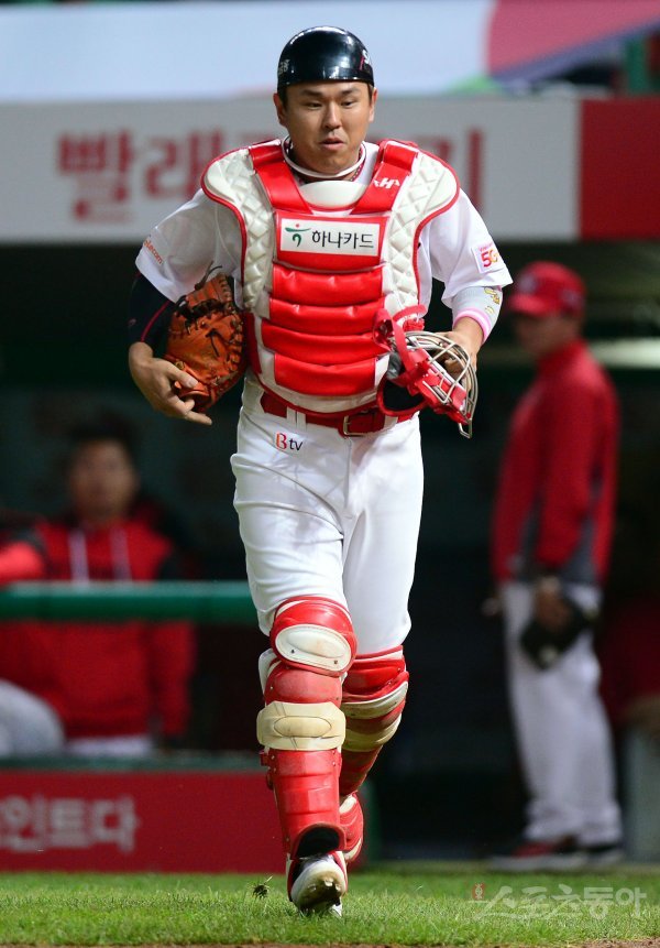 14일 인천 SK행복드림구장에서 ‘2017 타이어뱅크 KBO리그’ SK 와이번스와 한화 이글스의 경기가 열렸다. 8회초 2사 1루에서 한화 김경언 타석 때 SK 이홍구의 부상으로 나주환이 포수 마스크를 쓰고 나서고 있다.