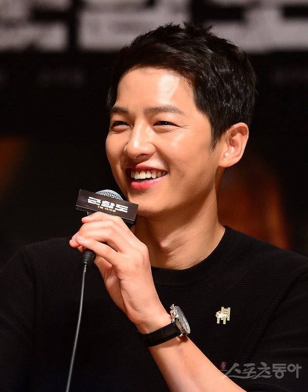 15일 서울 용산구 국립중앙박물관 극장 용에서 영화 ‘군함도’의 제작보고회가 열렸다. 배우 송중기가 환하게 웃고 있다.