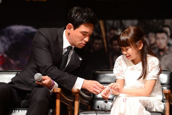 15일 서울 용산구 국립중앙박물관 극장 용에서 영화 ‘군함도’의 제작보고회가 열렸다. 배우 황정민과 아역배우 김수안(오른쪽)이 대화를 나누고 있다.