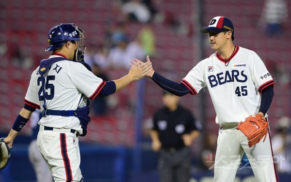 18일 서울 잠실야구장에서 열린 ‘2017 타이어뱅크 KBO 리그’ 두산 베어스와 NC 다이노스의 경기에서 난타전 끝에 두산이 13-11로 승리하며 위닝시리즈를 달성했다. 경기 후 포수 양의지와 마무리 이용찬(오른쪽)이 기쁨을 나누고 있다.