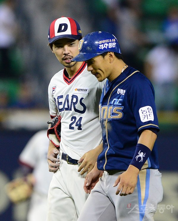18일 서울 잠실야구장에서 열린 ‘2017 타이어뱅크 KBO 리그’ 두산 베어스와 NC 다이노스의 경기에서 난타전 끝에 두산이 13-11로 승리하며 위닝시리즈를 달성했다. 경기 후 두산 오재원이 NC 이종욱(오른쪽)과 대화를 나누고 있다.