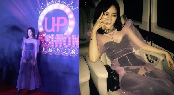 사진 속 지아는 ‘올 시스루 드레스’를 입고 과감한 패션을 선보였다. 튜브톱 점프수트와 롱부츠, 가터벨트를 착용한 후 위에 분홍색 시스루 재질의 드레스를 매치해 독특한 느낌을 자아냈다.
