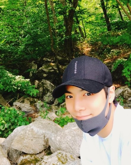 사진 속 김종현은 산을 배경으로 모자와 마스크를 쓴 채 사진을 찍었다. 햇빛을 받아 윤이 나는 종현의 피부가 더욱 돋보인다.