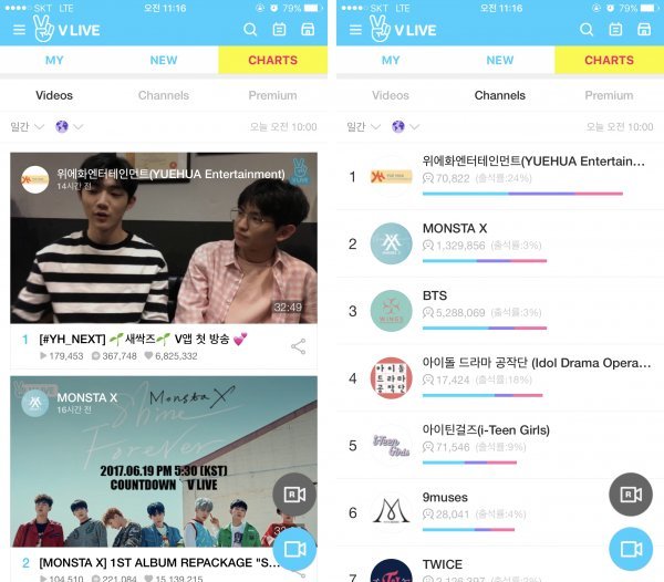 또 안형섭과 이의웅이 출연한 위에화 엔터테인먼트 채널 \'YH_NEXT\'는 생방송 실시간 17만9,453명 하트는 7백만에 가까운 수치를 기록해 19일 V앱 채널과 동영상 1위에 올랐다.