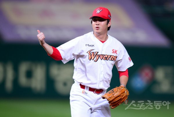 20일 인천 SK행복드림구장에서 ‘2017 타이어뱅크 KBO리그’ SK 와이번스와 NC 다이노스의 경기가 열렸다. 9회초 2사 1루에서 SK 선발 문승원이 NC 지석훈을 삼진 아웃시키며 완투승을 기록한 뒤 손짓하고 있다.