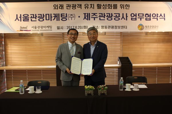 서울관광마케팅(사장 김병태)은 서울지역 외래 관광객 유치 확대를 위해 타 지자체와의 공동협력을 강화하기 위해 20일 서울 명동관광정보센터에서 제주관광공사(사장 최갑열)와 업무협약을 체결했다.