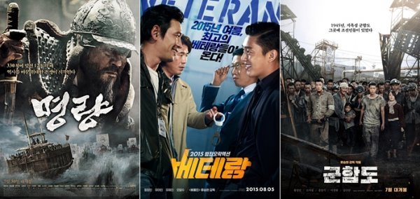 또한 안하무인 유아독존 재벌 3세와 그를 쫓는 베테랑 광역수사대의 활약을 그린 영화 ‘베테랑’(1,341만 명)은 류승완 감독과 황정민, 유아인, 유해진, 오달수 등 대한민국 대표 연기파 배우들의 결합과 팀플레이로 짜릿한 액션 쾌감을 전달, 2015년 여름 극장가를 뜨겁게 달구며 역대 박스오피스 3위에 올랐다. 특히 현실감 있는 광역수사대 캐릭터가 재벌 3세에 맞서는 모습은 통쾌하고 시원한 카타르시스를 선사, 베테랑 신드롬을 일으키며 전국을 뒤흔들었다. 이렇듯 이름만으로도 신뢰를 주는 대한민국 대표 배우들의 캐스팅과 공감대 높은 스토리, 시대를 관통하는 카타르시스와 볼거리를 선사하며 여름 극장가를 사로잡은 ‘명량’과 ‘베테랑’의 흥행세를 2017년 ‘군함도’가 이어갈 예정이다.