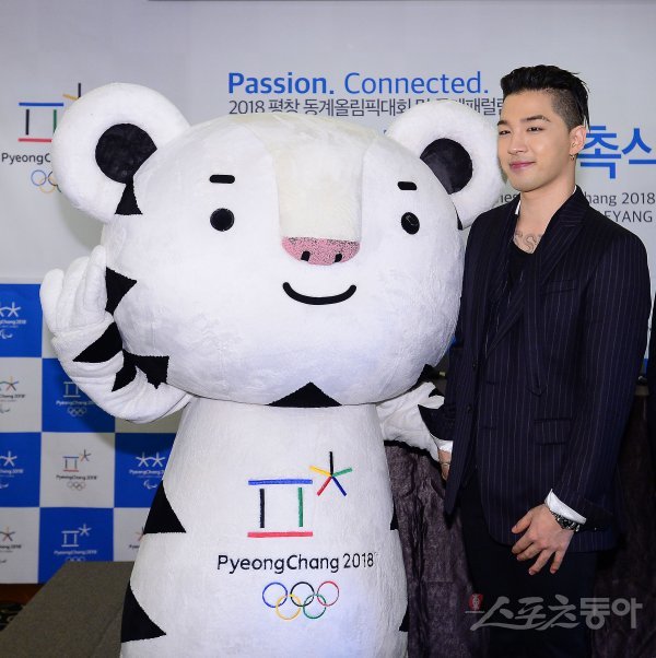 21일 서울 중구 한국프레스센터 18층 외신기자클럽에서 2018 평창 동계올림픽대회 및 동계패럴림픽대회 홍보대사 위촉식이 열렸다. 빅뱅의 태양이 평창 동계올림픽 마스코트 수호랑과 기념촬영을 하고 있다.