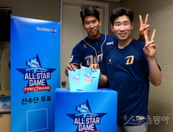 21일 인천 SK행복드림구장에서 ‘2017 타이어뱅크 KBO리그’ SK 와이번스와 NC 다이노스의 경기가 열린다. 경기전 NC 모창민과 이재학이 올스타전 선수단 투표함에 투표하고 있다.