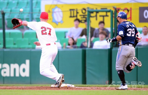 21일 인천 SK행복드림구장에서 ‘2017 타이어뱅크 KBO리그’ SK 와이번스와 NC 다이노스의 경기가 열렸다. 3회초 1사 1루에서 NC 이종욱이 상대 송구 실책으로 출루하고 있다.