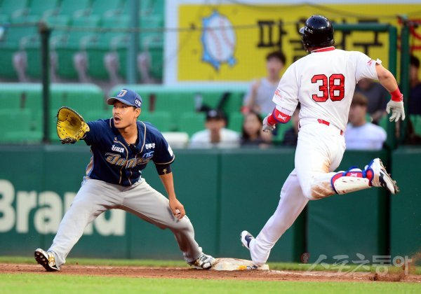 21일 인천 SK행복드림구장에서 ‘2017 타이어뱅크 KBO리그’ SK 와이번스와 NC 다이노스의 경기가 열렸다. 4회말 1사에서 SK 김동엽이 내야 안타로 출루하고 있다.