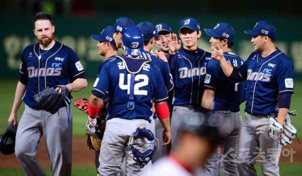 21일 인천 SK행복드림구장에서 ‘2017 타이어뱅크 KBO리그’ SK 와이번스와 NC 다이노스의 경기가 열렸다. NC가 SK에 2-1로 승리한 뒤 완투승을 거둔 해커가 동료들과 기쁨을 나누고 있다.