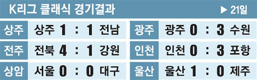 2위 울산현대는 오르샤의 선제 결승골로 안방에서 제주 유나이티드를 1-0으로 꺾고 8승4무3패, 승점 28로 선두 전북과의 격차를 그대로 유지했다. 인천 유나이티드와의 원정경기에서 3-0으로 이긴 포항 스틸러스(8승1무6패·승점 25)는 5위에서 3위로 도약했다. 수원삼성도 조나탄의 2골 활약에 힘입어 적지에서 광주FC를 3-0으로 제압했다. 상주상무와 전남 드래곤즈는 1-1, FC서울과 대구FC는 0-0으로 비겼다.