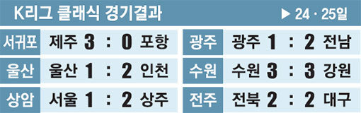 한편 수원삼성은 강원FC와의 홈경기에서 아쉽게 3-3으로 비겼다. 전반까지 3-1로 앞선 수원은 후반 막판 15분여를 버티지 못했다. 후반 32분 강원 이근호에게 추격골을 내준 데 이어 후반 44분 베테랑 수비수 조원희의 헤딩 자책골로 다 잡았던 승점 3점을 눈앞에서 놓쳤다. 수원(6승6무4패·승점 24)은 6위를 유지한 반면 강원(7승4무5패·승점 25)은 4위로 도약했다. 상주상무는 원정에서 FC서울(5승6무5패·승점 21)을 2-1로 꺾고 5승5무6패, 승점 20으로 9위에서 8위로 한 계단 올라섰다.