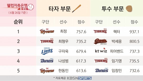 26일 발표된‘웰컴저축은행 톱랭킹 차트(종합)’타자 1위는 SK 최정(757.6), 투수 1위는 KIA 헥터(937.1)다. 승리기여도와 상황중요도가 반영된 6월 4주차‘웰컴저축은행 톱랭킹 차트(데일리)’에서는 NC 나성범(타자), SK 문승원(투수)가 크게 활약하며 팀을 승리로 이끌었다.