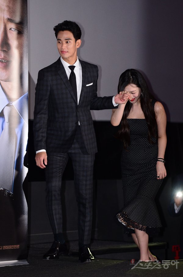 배우 김수현이 최진리(오른쪽)의 손을 잡고 무대로 입장하고 있다.
