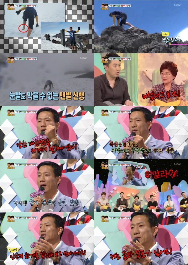 이에 스튜디오에 출연한 아들은 "한 겨울에 모든 산을 정복했다. 태백산, 지리산, 설악산, 한라산, 관악산을 다 정복했다. 6월에는 후지산도 맨발로 정복을 했다"라고 말해 모두를 깜짝 놀라게 했다.