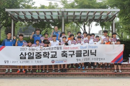 프로축구 K리그 챌린지 수원FC가 26일 수원 삼일중학교(수원시 팔달구 매향동)에서 축구 동아리 40여명을 대상으로 축구 클리닉을 진행하며 축구를 통한 사랑을 나눴다.