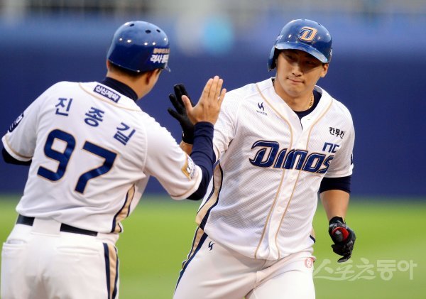 27일 창원 마산야구장에서 ‘2017 타이어뱅크 KBO리그’ NC 다이노스와 넥센 히어로즈의 경기가 열렸다. 1회말 2사 1루에서 NC 나성범이 넥센 선발 신재영을 상대로 중월 투런 홈런을 쏘아올린 뒤 진종길 코치의 환영을 받고 있다.