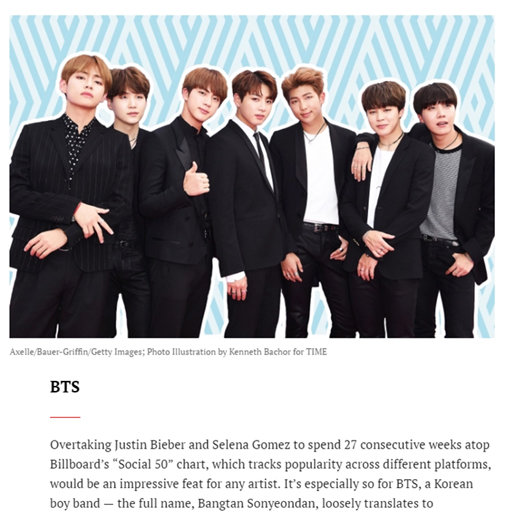 타임은 미국 대통령 도널드 트럼프, 해리포터의 작가 조앤 K. 롤링 등과 함께 방탄소년단을 ‘인터넷에서 가장 영향력 있는 25인(The 25 Most Influential People on the Internet)’으로 꼽았다. “소셜미디어에 대한 전 세계적인 영향력과 화제성을 검토했다”는 타임은 방탄소년단이 “다양한 플랫폼에서 인기를 집계하는 빌보드 소셜50 차트에서 저스틴 비버, 셀레나 고메즈를 제치고 27주 1위를 차지했다.
