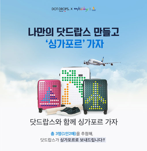 LF ‘닷드랍스’가 7월24일까지 LF몰에서 ‘나만의 닷드랍스 만들고 싱가포르 가자’ 이벤트를 연다. 1인 2매 싱가포르 왕복 항공권, 조식 포함 숙박권 및 유니버설스튜디오 입장권으로 구성된 싱가포르 항공의 ‘시아홀리데이 3박5일 이용권’을 제공한다. 브랜드 제품 누적 구매액이 가장 높은 고객 1명과 SNS 공유 이벤트에 참여한 고객 중 2명을 선정한다.