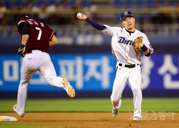 27일 창원 마산야구장에서 ‘2017 타이어뱅크 KBO리그’ NC 다이노스와 넥센 히어로즈의 경기가 열렸다. 6회초 1사 1루에서 넥센 김민성의 내야땅볼 때 1루 주자 김하성이 2루에서 NC 지석훈에게 포스 아웃되고 있다.