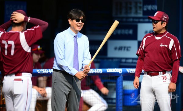28일 창원 마산야구장에서 ‘2017 타이어뱅크 KBO리그’ NC 다이노스와 넥센 히어로즈의 경기가 열린다. 경기전 정민철 해설위원이 넥센 코치들과 이야기를 나누고 있다.