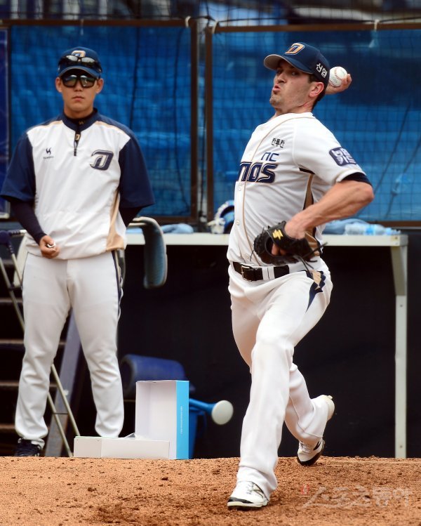 28일 창원 마산야구장에서 ‘2017 타이어뱅크 KBO리그’ NC 다이노스와 넥센 히어로즈의 경기가 열린다. 부상으로 1군 엔트리에 빠진 NC 맨쉽이 7월 복귀를 위해 불펜에서 몸을 풀고 있다.