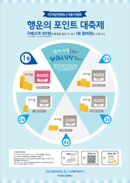 아가방앤컴퍼니가 7월19일까지 ‘행운의 포인트 대축제’ 이벤트를 연다. 대표 브랜드 아가·에뜨와·디어베이비 등 전국 200여개 가두점에서 진행되며, 오프라인 매장과 온라인몰에서 현금처럼 사용할 수 있는 포인트를 룰렛 게임 방식을 통해 지급한다. 등수 별 1000P부터 최대 8만P까지 지급하며, 구매 금액 기준 3만원 단위로 1회씩 참여 가능하다.
