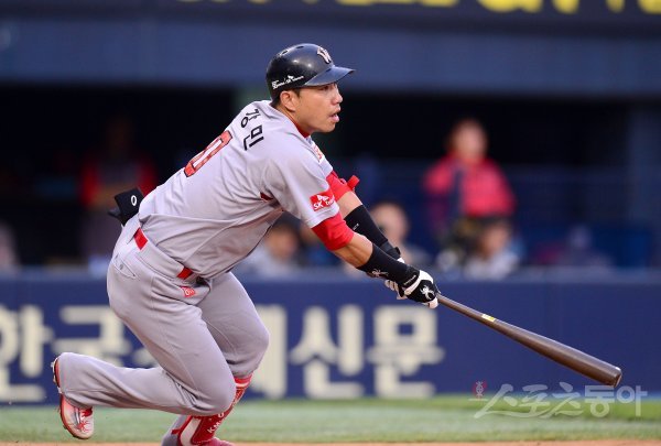 28일 잠실야구장에서 ‘2017 타이어뱅크 KBO 리그’ SK와이번스와 두산베어스의 경기가 열렸다. 4회초 무사 1,2루 SK 김강민이 우전 안타를 치고 있다.