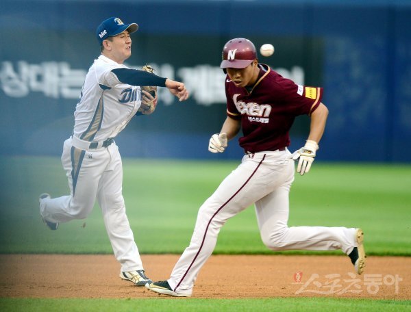 28일 창원 마산야구장에서 ‘2017 타이어뱅크 KBO리그’ NC 다이노스와 넥센 히어로즈의 경기가 열렸다. 1회초 무사 1, 3루에서 넥센 서건창의 1타점 내야땅볼 때 1루 주자 고종욱이 2루에서 NC 손시헌에게 포스 아웃되고 있다.