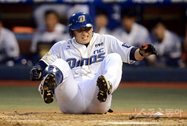 28일 창원 마산야구장에서 ‘2017 타이어뱅크 KBO리그’ NC 다이노스와 넥센 히어로즈의 경기가 열렸다. 3회말 2사 1, 3루에서 NC 나성범이 넥센 브리검의 볼에 맞은 뒤 고통을 호소하고 있다.