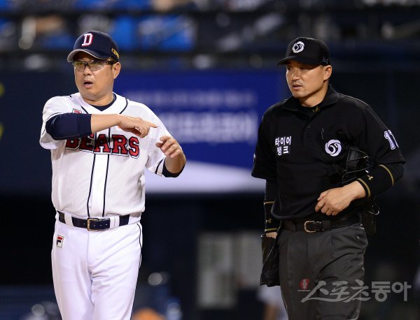 28일 잠실야구장에서 ‘2017 타이어뱅크 KBO 리그’ SK와이번스와 두산베어스의 경기가 열렸다. 8회초 1사 3루 SK 김강민 타석 때 폭투로 실점을 하자 김태형 감독이 몸에 맞는 볼이라며 비디오판독을 요청하고 있다. 결과는 폭투.