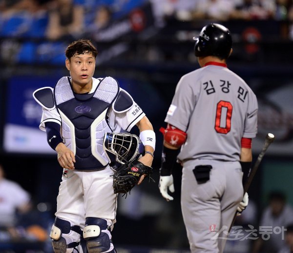 28일 잠실야구장에서 ‘2017 타이어뱅크 KBO 리그’ SK와이번스와 두산베어스의 경기가 열렸다. 8회초 1사 3루 SK 김강민 타석 때 폭투로 실점을 하자 두산 박세혁이 몸에 맞는 볼이라며 어필하고 있다.