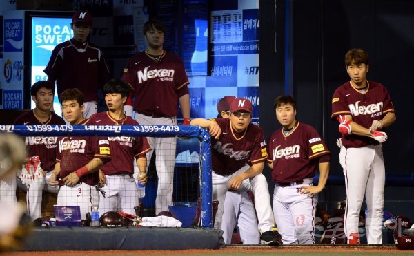28일 창원 마산야구장에서 ‘2017 타이어뱅크 KBO리그’ NC 다이노스와 넥센 히어로즈의 경기가 열렸다. 3-9로 뒤진 9회초 넥센의 마지막 공격 때 더그아웃의 선수들이 경기를 지켜보고 있다.