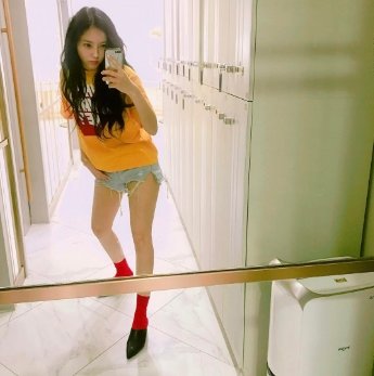 사진 속 효민은 노란색 티셔츠에 짧은 청바지를 입어 캐주얼하며 장난꾸러기 같은 패션을 하고는 그에 걸맞은 익살맞은 포즈를 취했다.