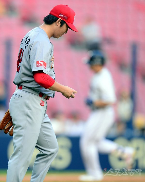29일 서울 잠실야구장에서 ‘2017 타이어뱅크 KBO리그’ 두산 베어스와 SK 와이번스의 경기가 열렸다. 1회말 무사 1, 2루에서 두산 김재환에게 3점 홈런을 허용한 SK 선발 문승원이 고개를 숙이고 있다.